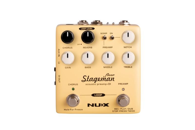 NUX Stageman Acoustic Amplifiers Natural Sound is now in a Pocket Size Improved Clarity NUX Stageman Floor is an analog acoustic preamp with digital effects and looper function. Preamp featured with a highly sensitive 3-band EQ with MID scoop toggle switch, adjustable notch filter, and input gain control. And it provides a ginormous headroom which delivers the sound all natural. High-Quality Effects, Easy Control It equipped with Chorus and Reverb effects and, each effect designed to control by only one-knob, when you tweak the chorus or reverb knob from 0 to 10 it adjusts multiple parameters with a perfect balance. And the chorus switch has another function, while you push and hold, it will activate the freeze effect until you release it. Notch Filter You can turn ON the notch filter and adjust the frequency to clean the notch sound caused by a guitar pick or nails. Versatile Preamp There are Gain and 3-band EQ controls on the pedal. You can adjust the signal power by using the Gain knob. It has Bass, Middle and Treble controls, depending on the amplifier/speaker characteristic, playing style and acoustic guitar's body type you can tune your sound the way you like. You can optimize the preamp input according to your guitar pickup type, you can set Piezo or Magnetic for better signal processing. And it has the FX Loop input, you can use a TRS cable and connect any effect unit to Stageman Floor. Its also the best choice for various acoustic instruments like the violin, mandolin, banjo and many more. Record, Jam, Create! Push the both Chorus and Preamp footswitches, Stageman Floor turns into a looper pedal with 60 seconds recording capacity and unlimited overdubs. It's ready-to-jam at anytime, anywhere! In Looper mode: Preamp Footswitch controls the looper functions; Record/Play/Stop and Overdub Reverb Knob controls the Loop volume level. Connections Stageman Floor has all the useful input/output connections.